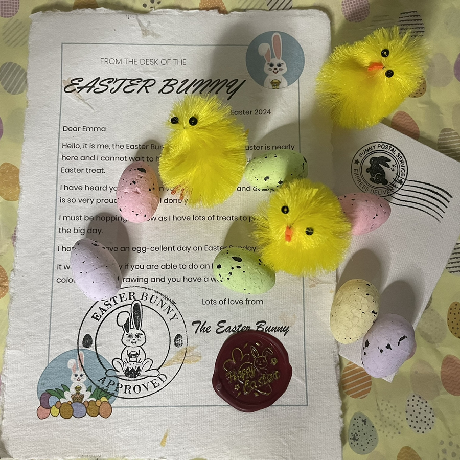 You also have the option to add a matching Easter Bunny certificate for your special person with Easter Bunny Official stamp and genuine wax seal. This is on white paper/card so it stands out when put into a frame (Not Supplied).